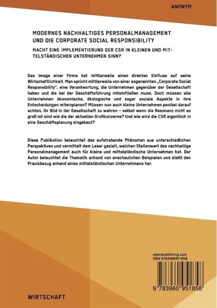Das Image einer Firma hat mittlerweile einen direkten Einfluss auf seine Wirtschaftlichkeit. Man spricht mittlerweile von einer sogenannten "Corporate Social Responsibility", eine Verantwortung, die Unternehmen gegenüber der Gesellschaft haben und die bei der Geschäftsführung miteinfließen muss. Doch müssen alle Unternehmen ökonomische, ökologische und sogar soziale Aspekte in ihre Entscheidungen miteinplanen? Müssen nun auch kleine Unternehmen penibel darauf achten, ihr Bild in der Gesellschaft zu wahren - selbst wenn die Resonanz nicht so groß ist sind wie die der aktuellen Großkonzerne? Und wie wird die CSR eigentlich in eine Geschäftsplanung eingebaut?Diese Publikation beleuchtet das aufstrebende Phänomen aus unterschiedlichen Perspektiven und vermittelt dem Leser gezielt, welchen Stellenwert das nachhaltige Personalmanagement auch für kleine und mittelständische Unternehmen hat. Der Autor beleuchtet die Thematik anhand von anschaulichen Beispielen und stellt den Praxisbezug anhand eines mittelständischen Unternehmens her. Aus dem Inhalt:Corporate Social Responsibility;CSR;Personalmanagement;KMU;Nachhaltigkeit;Unternehmen und Gesellschaft.