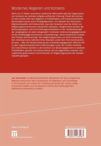 Nicht nur in Zeiten unsicherer politischer Mehrheiten gilt die Organisation von Konsens als zentrale Aufgabe politischer Führung. Inhalt des Buches ist eine Studie über das Regieren in Politikfeldern und konsensorientierte Beratungsprozesse durch Kollegialgremien. Am Beispiel der deutschen Migrationspolitik wird beleuchtet, was das Einsetzen und die Arbeit von Regierungskommissionen tatsächlich bedeuten. Vergleichend werden die Beratungsregime und Entscheidungsmodalitäten in der Ausländerpolitik der vergangenen 60 Jahre rekapituliert. Konkreter Untersuchungsgegenstand ist die Unabhängige Kommission »Zuwanderung«, deren empirische Analyse drei Phasen berücksichtigt: den Regierungsprozess vor ihrer Einsetzung, den Arbeitsprozess während ihres Mandats sowie den Post-Kommissionsprozess - über die Verabschiedung des Zuwanderungsgesetzes 2004 bis hin zu den migrationspolitischen Entwicklungen unter der Großen Koalition. Die Erkenntnisse werden in den Kontext von Beratungsgremien in anderen Politikfeldern gestellt und Rückschlüsse auf die allgemeine Funktion und Legitimität gubernativer Kommissionen im Regierungssystem der Bundesrepublik gezogen.