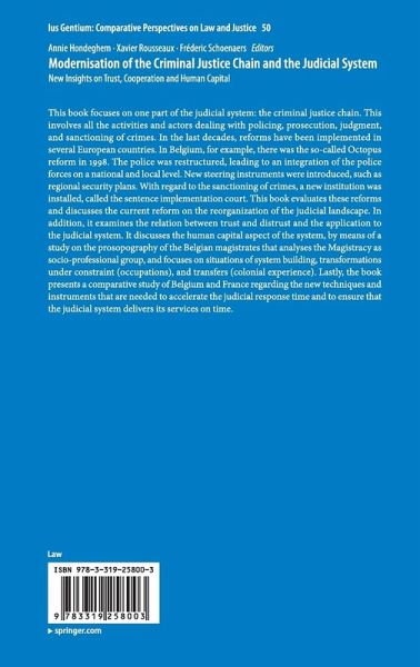 This book focuses on one part of the judicial system: the criminal justice chain. This involves all the activities and actors dealing with policing, prosecution, judgment, and sanctioning of crimes. In the last decades, reforms have been implemented in several European countries. In Belgium, for example, there was the so-called Octopus reform in 1998. The police was restructured, leading to an integration of the police forces on a national and local level. New steering instruments were introduced, such as regional security plans. With regard to the sanctioning of crimes, a new institution was installed, called the sentence implementation court. This book evaluates these reforms and discusses the current reform on the reorganization of the judicial landscape. In addition, it examines the relation between trust and distrust and the application to the judicial system. It discusses the human capital aspect of the system, by means of a study on the prosopography of the Belgian magistrates that analyses the Magistracy as socio-professional group, and focuses on situations of system building, transformations under constraint (occupations), and transfers (colonial experience). Lastly, the book presents a comparative study of Belgium and France regarding the new techniques and instruments that are needed to accelerate the judicial response time and to ensure that the judicial system delivers its services on time.