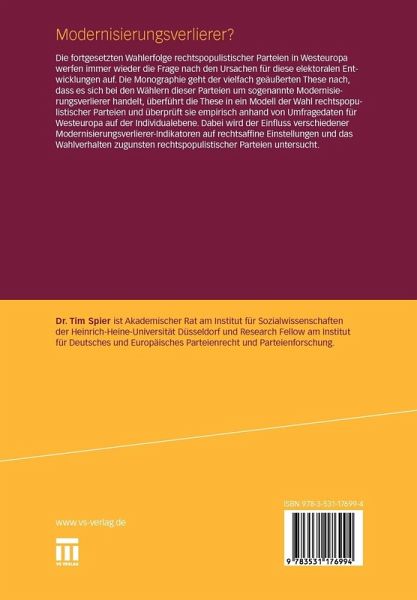 Die fortgesetzten Wahlerfolge rechtspopulistischer Parteien in Westeuropa werfen immer wieder die Frage nach den Ursachen für diese elektoralen Entwicklungen auf. Die Monographie geht der vielfach geäußerten These nach, dass es sich bei den Wählern dieser Parteien um sogenannte Modernisierungsverlierer handelt, überführt die These in ein Modell der Wahl rechtspopulistischer Parteien und überprüft sie empirisch anhand von Umfragedaten für Westeuropa auf der Individualebene. Dabei wird der Einfluss verschiedener Modernisierungsverlierer-Indikatoren auf rechtsaffine Einstellungen und das Wahlverhalten zugunsten rechtspopulistischer Parteien untersucht.