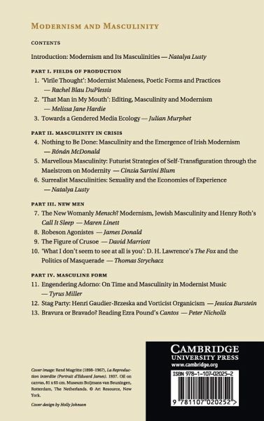 Modernism and Masculinity investigates the varied dimensions and manifestations of masculinity in the modernist period. Thirteen essays from leading scholars reframe critical trends in modernist studies by examining distinctive features of modernist literary and cultural work through the lens of masculinity and male privilege. The volume attends to masculinity as an unstable horizon of gendered ideologies, subjectivities and representational practices, allowing for fresh interdisciplinary treatments of celebrated and lesser-known authors, artists and theorists such as D. H. Lawrence, Ezra Pound, Henry Roth, Theodor Adorno and Paul Robeson as well as modernist avant-garde movements such as vorticism, surrealism and futurism. As diverse as the masculinities that were played out across the early twentieth century, the approaches and arguments featured in this collection will appeal especially to scholars and students of modernist literature and culture, gender studies and English literature more broadly.