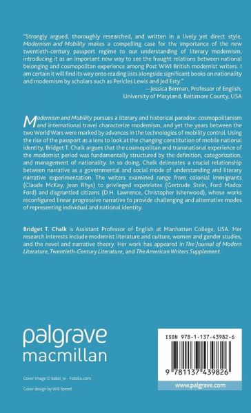 "Bridget Chalk's Modernism and Mobility: The Passport and Cosmopolitan Experience (2014) is the first book-length study taking up this recognition of the modern passport's impact on modern literature, and it arrives none too soon in the burgeoning field of literary passport studies. ... Chalk's book is a welcome and necessary contribution to modernist studies, and the incipient area of literary passport studies." (Nissa Ren Cannon, Journal of Modern Literature, Vol. 41 (1), 2017)