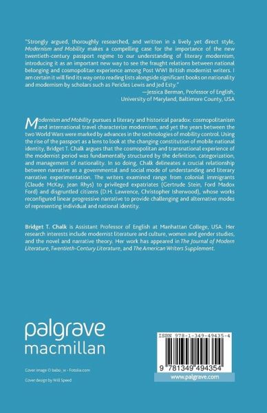 "Bridget Chalk's Modernism and Mobility: The Passport and Cosmopolitan Experience (2014) is the first book-length study taking up this recognition of the modern passport's impact on modern literature, and it arrives none too soon in the burgeoning field of literary passport studies. ... Chalk's book is a welcome and necessary contribution to modernist studies, and the incipient area of literary passport studies." (Nissa Ren Cannon, Journal of Modern Literature, Vol. 41 (1), 2017)