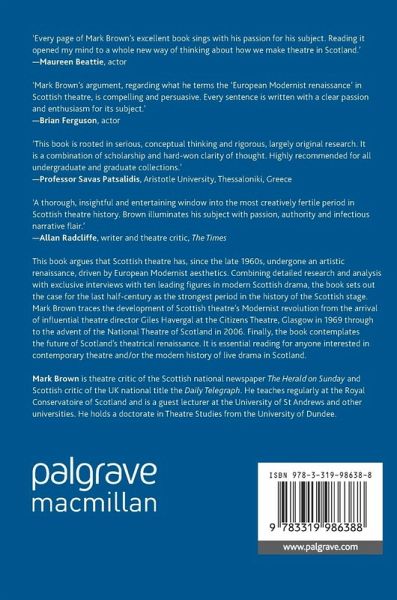 This book argues that Scottish theatre has, since the late 1960s, undergone an artistic renaissance, driven by European Modernist aesthetics. Combining detailed research and analysis with exclusive interviews with ten leading figures in modern Scottish drama, the book sets out the case for the last half-century as the strongest period in the history of the Scottish stage. Mark Brown traces the development of Scottish theatre's Modernist revolution from the arrival of influential theatre director Giles Havergal at the Citizens Theatre, Glasgow in 1969 through to the advent of the National Theatre of Scotland in 2006. Finally, the book contemplates the future of Scotland's theatrical renaissance. It is essential reading for anyone interested in contemporary theatre and/or the modern history of live drama in Scotland.