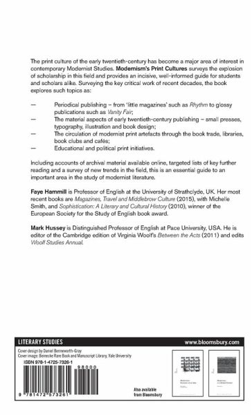 The print culture of the early twentieth century has become a major area of interest in contemporary Modernist Studies. Modernism's Print Cultures surveys the explosion of scholarship in this field and provides an incisive, well-informed guide for students and scholars alike. Surveying the key critical work of recent decades, the book explores such topics as: - Periodical publishing - from 'little magazines' such as Rhythm to glossy publications such as Vanity Fair - The material aspects of early twentieth-century publishing - small presses, typography, illustration and book design - The circulation of modernist print artefacts through the book trade, libraries, book clubs and cafes - Educational and political print initiatives Including accounts of archival material available online, targeted lists of key further reading and a survey of new trends in the field, this is an essential guide to an important area in the study of modernist literature.