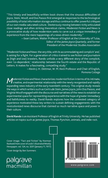 "Modernist Fiction and News: the very title, with its accommodating and complicit 'and,' is asking for a fight. For a generation of critics trained to see fiction and journalism as (high and low) brawlers, Rando unfolds a very different story of the complicit, even 'co-dependent,' relationship between the fourth estate and the Republic of Letters. It makes for a fascinating, compelling study." - Kevin J. H. Dettmar, W. M. Keck Professor and Chair of English, Pomona College