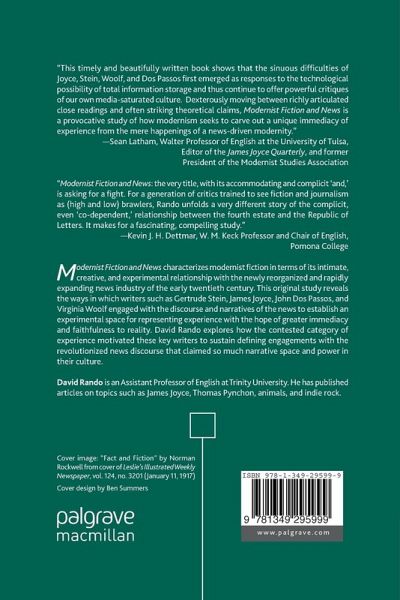 "Modernist Fiction and News: the very title, with its accommodating and complicit 'and,' is asking for a fight. For a generation of critics trained to see fiction and journalism as (high and low) brawlers, Rando unfolds a very different story of the complicit, even 'co-dependent,' relationship between the fourth estate and the Republic of Letters. It makes for a fascinating, compelling study." - Kevin J. H. Dettmar, W. M. Keck Professor and Chair of English, Pomona College