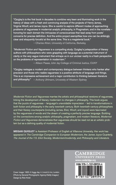 Modernist Fiction and Vagueness marries the artistic and philosophical versions of vagueness, linking the development of literary modernism to changes in philosophy. This book argues that the problem of vagueness - language's unavoidable imprecision - led to transformations in both fiction and philosophy in the early twentieth century. Both twentieth-century philosophers and their literary counterparts (including James, Eliot, Woolf, and Joyce) were fascinated by the vagueness of words and the dream of creating a perfectly precise language. Building on recent interest in the connections between analytic philosophy, pragmatism, and modern literature, Modernist Fiction and Vagueness demonstrates that vagueness should be read not as an artistic problem but as a defining quality of modernist fiction.