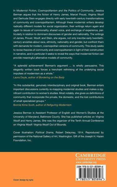 In Modernist Fiction, Cosmopolitanism and the Politics of Community, first published in 2001, Jessica Berman argues that the fiction of Henry James, Marcel Proust, Virginia Woolf and Gertrude Stein engages directly with early twentieth-century transformations of community and cosmopolitanism. Although these modernist writers develop radically different models for social organization, their writings return again and again to issues of commonality, shared voice, and exchange of experience, particularly in relation to dominant discourses of gender and nationality. The writings of James, Proust, Woolf and Stein, she argues, not only inscribe early twentieth-century anxieties about race, ethnicity, nationality and gender, but confront them with demands for modern, cosmopolitan versions of community. This study seeks to revise theories of community and cosmopolitanism in light of their construction in narrative, and in particular it seeks to reveal the ways that modernist fiction can provide meaningful alternative models of community.