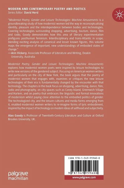 Modernist Poetry, Gender and Leisure Technologies: Machine Amusements explores how modernist women poets were inspired by leisure technologies to write new versions of the gendered subject. Focusing on American women writers and particularly on the city of New York, the book argues that the poetry of modernist women that engages with, examines or critiques the new leisure technologies of their era is fundamentally changed by the encounter with that technology. The chapters in the book focus on shopping, advertising, dance, film, radio and phonography, on city spaces such as Coney Island, Greenwich Village and Harlem, and on poetry that embraces the linguistic and formal innovations of modernism whilst paying close attention to the embodied politics of gender. The technologized city, and the leisure cultures and media forms emerging from it, enabled modernist women writers to re-imagine forms of lyric embodiment, inspired by the impact of technology on modern ideas of selfhoodand subjectivity.