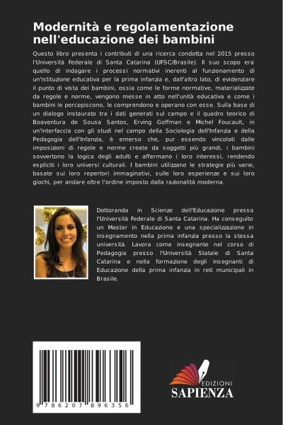 Questo libro presenta i contributi di una ricerca condotta nel 2015 presso l'Università Federale di Santa Catarina (UFSC/Brasile). Il suo scopo era quello di indagare i processi normativi inerenti al funzionamento di un'istituzione educativa per la prima infanzia e, dall'altro lato, di evidenziare il punto di vista dei bambini, ossia come le forme normative, materializzate da regole e norme, vengono messe in atto nell'unità educativa e come i bambini le percepiscono, le comprendono e operano con esse. Sulla base di un dialogo instaurato tra i dati generati sul campo e il quadro teorico di Boaventura de Sousa Santos, Erving Goffman e Michel Foucault, in un'interfaccia con gli studi nel campo della Sociologia dell'Infanzia e della Pedagogia dell'Infanzia, è emerso che, pur essendo vincolati dalle imposizioni di regole e norme create da soggetti più grandi, i bambini sovvertono la logica degli adulti e affermano i loro interessi, rendendo espliciti i loro universi culturali. I bambini utilizzano le strategie più varie, basate sui loro repertori immaginativi, sulle loro esperienze e sui loro giochi, per andare oltre l'ordine imposto dalla razionalità moderna.