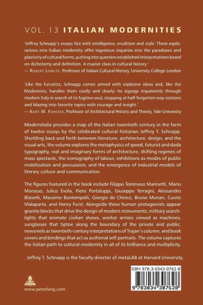 Modernitalia provides a map of the Italian twentieth century in the form of twelve essays by the celebrated cultural historian Jeffrey T. Schnapp. Shuttling back and forth between literature, architecture, design, and the visual arts, the volume explores the metaphysics of speed, futurist and dada typography, real and imaginary forms of architecture, shifting regimes of mass spectacle, the iconography of labour, exhibitions as modes of public mobilization and persuasion, and the emergence of industrial models of literary culture and communication.