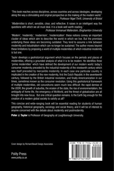 "Modern", "modernity", "modernism", "modernization" these notions convey an important cluster of ideas which aim to describe the world in which we live. But the premises underlying these ideas are becoming outdated. They tend to assume a link between modernity and industrialism which can no longer be sustained. The author moves beyond these limitations by proposing a world of multiple modernities of which industrial modernity is but one. Taylor develops a geohistorical argument which focuses on the periods and places of modernities, offering a grounded analysis of what it is to be modern. He identifies three "prime modernities" which have defined the development of our modern world: today's consumer modernity preceded by the industrial modernity of the nineteenth century which was itself preceded by mercantile modernity. In each case one particular country is implicated in the creation of the new modernity, first the Dutch Republic in the seventeenth century, followed by the British industrial revolution, and finally Americanization in our times, sometimes known as the consumer revolution. Using this geohistorical framework of multiple modernities, old conundrums seem much less difficult: the rapid demise of the USSR, the growth of suburbia, the erosion of the state, the rise of environmentalism, the ambiguity of home life, the emergency of McWorld, and the threat of globalization are all brought into new focus. But one critical question remains. Is the Earth big enough for the creation of a modern global society to satisfy us all? This concise and wide-ranging book will be essential reading for students of human geography, historical geography, sociology and social theory, and it will be of interest to anyone concerned with the debate about modernity and postmodernity.
