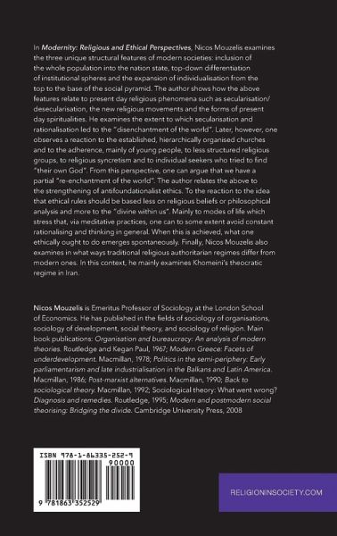 In Modernity: Religious and Ethical Perspectives Nicos Mouzelis examines the three unique structural features of modern societies: inclusion of the whole population into the nation state, top-down differentiation of institutional spheres and the expansion of individualisation from the top to the base of the social pyramid. The author shows how the above features relate to present day religious phenomena such as secularisation/desecularisation, the new religious movements and the forms of present day spiritualities. He examines the extent to which secularisation and rationalisation led to the "disenchantment of the world". Later, however, one observes a reaction to the established, hierarchically organised churches and to the adherence, mainly of young people, to less structured religious groups, to religious syncretism, and to individual seekers who tried to find "their own God". From this perspective, one can argue that we have a partial "re-enchantment of the world".
