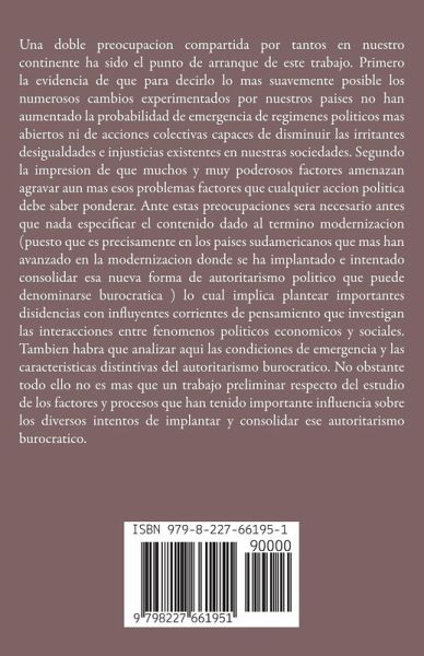 Una doble preocupacion compartida por tantos en nuestro continente ha sido el punto de arranque de este trabajo. Primero la evidencia de que para decirlo lo mas suavemente posible los numerosos cambios experimentados por nuestros paises no han aumentado la probabilidad de emergencia de regimenes politicos mas abiertos ni de acciones colectivas capaces de disminuir las irritantes desigualdades e injusticias existentes en nuestras sociedades. Segundo la impresion de que muchos y muy poderosos factores amenazan agravar aun mas esos problemas factores que cualquier accion politica debe saber ponderar. Ante estas preocupaciones sera necesario antes que nada especificar el contenido dado al termino modernizacion (puesto que es precisamente en los paises sudamericanos que mas han avanzado en la modernizacion donde se ha implantado e intentado consolidar esa nueva forma de autoritarismo politico que puede denominarse burocratica ) lo cual implica plantear importantes disidencias con influyentes corrientes de pensamiento que investigan las interacciones entre fenomenos politicos economicos y sociales. Tambien habra que analizar aqui las condiciones de emergencia y las caracteristicas distintivas del autoritarismo burocratico. No obstante todo ello no es mas que un trabajo preliminar respecto del estudio de los factores y procesos que han tenido importante influencia sobre los diversos intentos de implantar y consolidar ese autoritarismo burocratico.