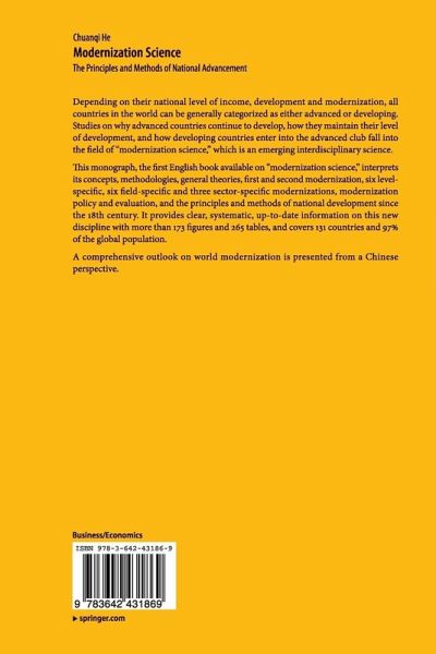 This monograph, the first English book available on "modernization science," interprets its concepts, methodologies, general theories, first and second modernization, six level-specific, six field-specific and three sector-specific modernizations, modernization policy and evaluation, and the principles and methods of national development since the 18th century. It provides clear, systematic, up-to-date information on this new discipline with more than 173 figures and 265 tables, and covers 131 countries and 97% of the global population.