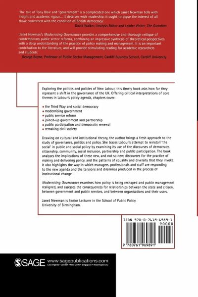 'The tale of Tony Blair and "government" is a complicated one which Janet Newman tells with insight and academic rigour¿.It deserves wide readership; it ought to pique the interest of all those concerned with the condition of British democracy' - David Walker, Analysis Editor and Leader Writer, The GuardianThe first comprehensive guide that explores the politics and policies of new Labour.This book offers:Critical insights into Labour's impact on:§ the relationship between government and citizens§ public services and their users§ the state and civil societyInterpretations of core themes in Labour's policy agenda:§ the Third Way and social democracy§ modernising government§ public service reform§ joined-up government and partnership§ public participation and democratic renewal§ remaking civil society
