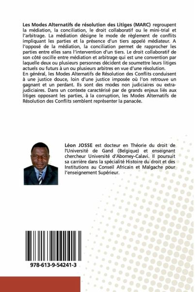 Les Modes Alternatifs de résolution des Litiges (MARC) regroupent la médiation, la conciliation, le droit collaboratif ou le mini-trial et l'arbitrage. La médiation désigne le mode de règlement de conflits impliquant les parties et la présence d'un tiers appelé médiateur. A l'opposé de la médiation, la conciliation permet de rapprocher les parties entre elles sans l'intervention d'un tiers. Le droit collaboratif de son côté oscille entre médiation et arbitrage qui est une convention par laquelle deux ou plusieurs personnes décident de soumettre leurs litiges actuels ou futurs à un ou plusieurs arbitres en vue d'une résolution. En général, les Modes Alternatifs de Résolution des Conflits conduisent à une justice douce, loin d'une justice imposée où l'on retrouve un gagnant et un perdant. Ils sont des modes non judiciaires ou extra-judiciaires. Dans un contexte caractérisé par de grands enjeux liés aux litiges opposant les parties, à la corruption, les Modes Alternatifs de Résolution des Conflits semblent représenter la panacée.