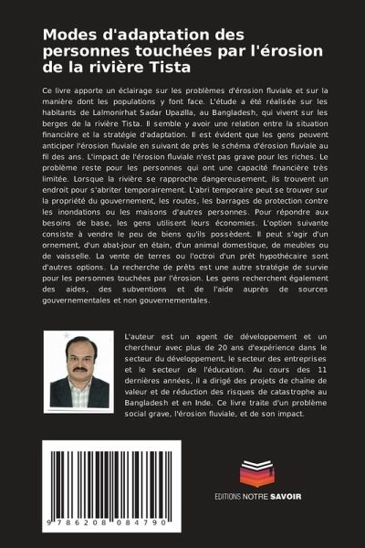 Ce livre apporte un éclairage sur les problèmes d'érosion fluviale et sur la manière dont les populations y font face. L'étude a été réalisée sur les habitants de Lalmonirhat Sadar Upazilla, au Bangladesh, qui vivent sur les berges de la rivière Tista. Il semble y avoir une relation entre la situation financière et la stratégie d'adaptation. Il est évident que les gens peuvent anticiper l'érosion fluviale en suivant de près le schéma d'érosion fluviale au fil des ans. L'impact de l'érosion fluviale n'est pas grave pour les riches. Le problème reste pour les personnes qui ont une capacité financière très limitée. Lorsque la rivière se rapproche dangereusement, ils trouvent un endroit pour s'abriter temporairement. L'abri temporaire peut se trouver sur la propriété du gouvernement, les routes, les barrages de protection contre les inondations ou les maisons d'autres personnes. Pour répondre aux besoins de base, les gens utilisent leurs économies. L'option suivante consiste à vendre le peu de biens qu'ils possèdent. Il peut s'agir d'un ornement, d'un abat-jour en étain, d'un animal domestique, de meubles ou de vaisselle. La vente de terres ou l'octroi d'un prêt hypothécaire sont d'autres options. La recherche de prêts est une autre stratégie de survie pour les personnes touchées par l'érosion. Les gens recherchent également des aides, des subventions et de l'aide auprès de sources gouvernementales et non gouvernementales.