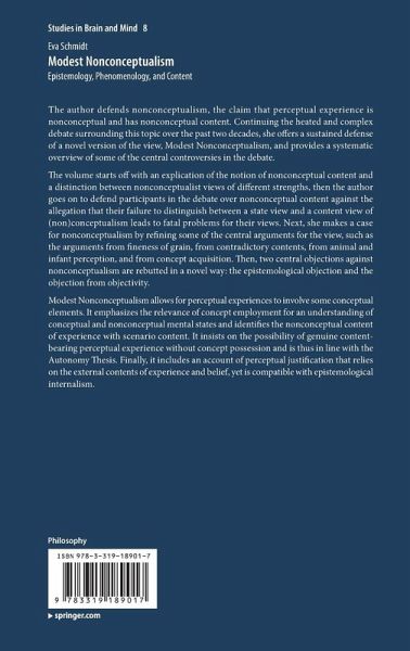 An explication of the notion of nonconceptual content and a distinction between nonconceptualist views of different strengths starts off the volume, then the author goes on to defend participants in the debate over nonconceptual content against the allegation that their failure to distinguish between a state view and a content view of (non)conceptualism leads to fatal problems for their views. Next, she makes a case for nonconceptualism by refining some of the central arguments for the view, such as the arguments from fineness of grain, from contradictory contents, from animal and infant perception, and from concept acquisition. Then, two central objections against nonconceptualism are rebutted in a novel way: the epistemological objection and the objection from objectivity.