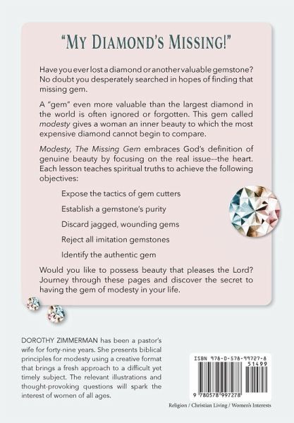 "MY DIAMOND'S MISSING!" Have you ever lost a diamond or another valuable gemstone? No doubt you desperately searched in hopes of finding that missing gem. A "gem" even more valuable than the largest diamond in the world is often ignored or forgotten. This gem called modesty gives a woman an inner beauty to which the most expensive diamond cannot begin to compare. Modesty, The Missing Gem embraces God's definition of genuine beauty by focusing on the real issue--the heart. Each lesson teaches spiritual truths to achieve the following objectives: Expose the tactics of gem cutters Establish a gemstone's purity Discard jagged, wounding gems Reject all imitation gemstones Identify the authentic gem Would you like to possess beauty that pleases the Lord? Journey through these pages and discover the secret to having the gem of modesty in your life.