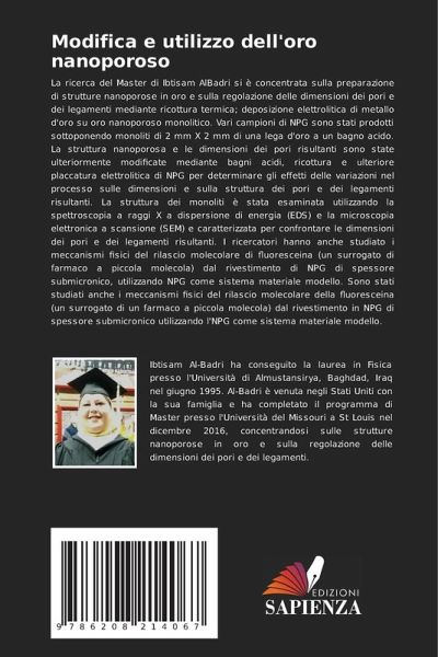 La ricerca del Master di Ibtisam AlBadri si è concentrata sulla preparazione di strutture nanoporose in oro e sulla regolazione delle dimensioni dei pori e dei legamenti mediante ricottura termica; deposizione elettrolitica di metallo d'oro su oro nanoporoso monolitico. Vari campioni di NPG sono stati prodotti sottoponendo monoliti di 2 mm X 2 mm di una lega d'oro a un bagno acido. La struttura nanoporosa e le dimensioni dei pori risultanti sono state ulteriormente modificate mediante bagni acidi, ricottura e ulteriore placcatura elettrolitica di NPG per determinare gli effetti delle variazioni nel processo sulle dimensioni e sulla struttura dei pori e dei legamenti risultanti. La struttura dei monoliti è stata esaminata utilizzando la spettroscopia a raggi X a dispersione di energia (EDS) e la microscopia elettronica a scansione (SEM) e caratterizzata per confrontare le dimensioni dei pori e dei legamenti risultanti. I ricercatori hanno anche studiato i meccanismi fisici del rilascio molecolare di fluoresceina (un surrogato di farmaco a piccola molecola) dal rivestimento di NPG di spessore submicronico, utilizzando NPG come sistema materiale modello. Sono stati studiati anche i meccanismi fisici del rilascio molecolare della fluoresceina (un surrogato di un farmaco a piccola molecola) dal rivestimento in NPG di spessore submicronico utilizzando l'NPG come sistema materiale modello.