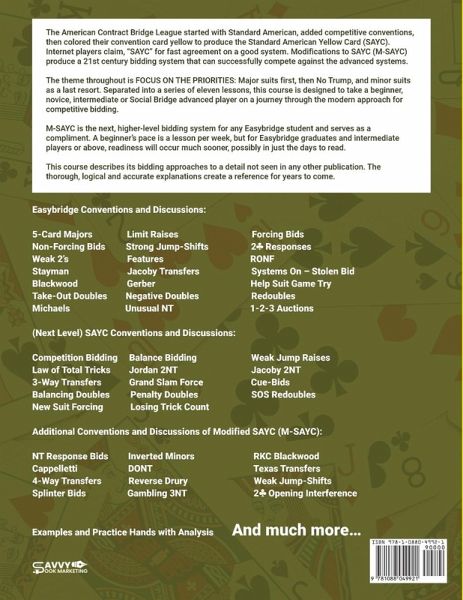 The American Contract Bridge League started with Standard American, added competitive conventions, and then coloured their convention card yellow to produce the Standard American Yellow Card (SAYC). Internet players claim, "SAYC" for fast agreement on a good system. Modifications to SAYC (M-SAYC) produce a 21st-century bidding system that can successfully compete against the advanced systems. The theme throughout is FOCUS ON THE PRIORITIES: Major suits first, then No Trump, and minor suits as a last resort. Separated into a series of eleven lessons, this course is designed to take a beginner, novice, intermediate or Social Bridge advanced player on a journey through the modern approach for competitive bidding. M-SAYC is the next, higher-level bidding system for any Easybridge student and serves as a compliment. A beginner's pace is a lesson per week, but for Easybridge graduates and intermediate players or above, readiness will occur much sooner, possibly in just the days to read. This course describes its bidding approaches to a detail not seen in any other publication. The thorough, logical and accurate explanations create a reference for years to come.