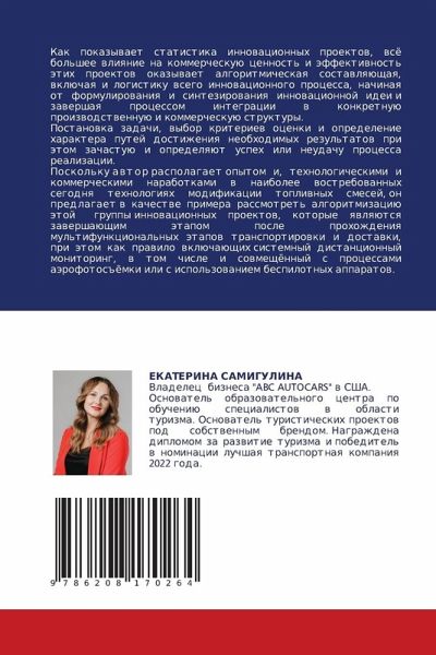 Kak pokazywaet statistika innowacionnyh proektow, wsö bol'shee wliqnie na kommercheskuü cennost' i äffektiwnost' ätih proektow okazywaet algoritmicheskaq sostawlqüschaq, wklüchaq i logistiku wsego innowacionnogo processa, nachinaq ot formulirowaniq i sintezirowaniq innowacionnoj idei i zawershaq processom integracii w konkretnuü proizwodstwennuü i kommercheskuü struktury.Postanowka zadachi, wybor kriteriew ocenki i opredelenie haraktera putej dostizheniq neobhodimyh rezul'tatow pri ätom zachastuü i opredelqüt uspeh ili neudachu processa realizacii.Poskol'ku awtor raspolagaet opytom i, tehnologicheskimi i kommercheskimi narabotkami w naibolee wostrebowannyh segodnq tehnologiqh modifikacii topliwnyh smesej, on predlagaet w kachestwe primera rassmotret' algoritmizaciü ätoj gruppy innowacionnyh proektow, kotorye qwlqütsq zawershaüschim ätapom posle prohozhdeniq mul'tifunkcional'nyh ätapow transportirowki i dostawki, pri ätom kak prawilo wklüchaüschih sistemnyj distancionnyj monitoring, w tom chisle i sowmeschönnyj s processami aärofotos#ömki ili s ispol'zowaniem bespilotnyh apparatow.
