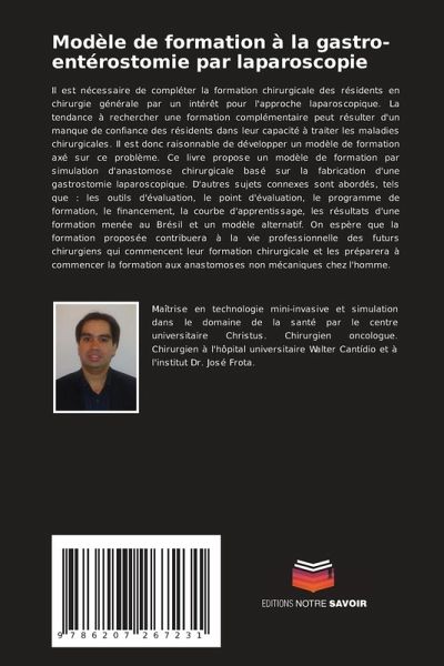 Il est nécessaire de compléter la formation chirurgicale des résidents en chirurgie générale par un intérêt pour l'approche laparoscopique. La tendance à rechercher une formation complémentaire peut résulter d'un manque de confiance des résidents dans leur capacité à traiter les maladies chirurgicales. Il est donc raisonnable de développer un modèle de formation axé sur ce problème. Ce livre propose un modèle de formation par simulation d'anastomose chirurgicale basé sur la fabrication d'une gastrostomie laparoscopique. D'autres sujets connexes sont abordés, tels que : les outils d'évaluation, le point d'évaluation, le programme de formation, le financement, la courbe d'apprentissage, les résultats d'une formation menée au Brésil et un modèle alternatif. On espère que la formation proposée contribuera à la vie professionnelle des futurs chirurgiens qui commencent leur formation chirurgicale et les préparera à commencer la formation aux anastomoses non mécaniques chez l'homme.