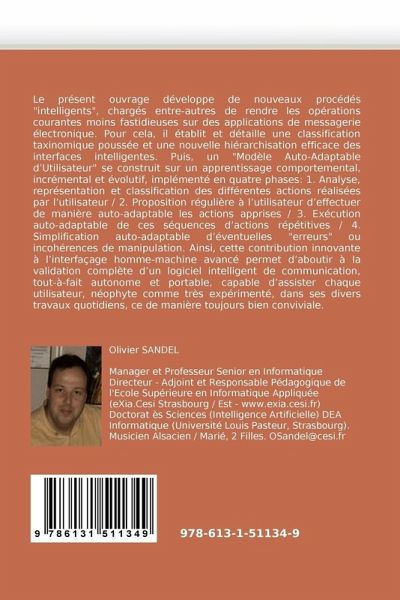 Le présent ouvrage développe de nouveaux procédés "intelligents", chargés entre-autres de rendre les opérations courantes moins fastidieuses sur des applications de messagerie électronique. Pour cela, il établit et détaille une classification taxinomique poussée et une nouvelle hiérarchisation efficace des interfaces intelligentes. Puis, un "Modèle Auto-Adaptable d Utilisateur" se construit sur un apprentissage comportemental, incrémental et évolutif, implémenté en quatre phases: 1. Analyse, représentation et classification des différentes actions réalisées par l utilisateur / 2. Proposition régulière à l utilisateur d effectuer de manière auto-adaptable les actions apprises / 3. Exécution auto-adaptable de ces séquences d actions répétitives / 4. Simplification auto-adaptable d éventuelles "erreurs" ou incohérences de manipulation. Ainsi, cette contribution innovante à l interfaçage homme-machine avancé permet d aboutir à la validation complète d un logiciel intelligent de communication, tout-à-fait autonome et portable, capable d assister chaque utilisateur, néophyte comme très expérimenté, dans ses divers travaux quotidiens, ce de manière toujours bien conviviale.