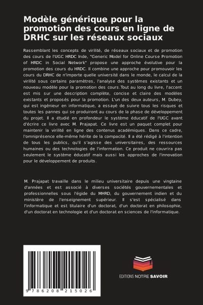 Rassemblant les concepts de virilité, de réseaux sociaux et de promotion des cours de l'UGC HRDC Inde, "Generic Model for Online Course Promotion of HRDC in Social Network" propose une approche évolutive pour la promotion des cours du HRDC. Il combine une approche pour promouvoir les cours du DRHC de n'importe quelle université dans le monde, le calcul de la virilité sous certains paramètres, l'analyse des systèmes existants et un nouveau modèle pour la promotion des cours.Tout au long du livre, l'accent est mis sur une description complète, concise et claire des modèles existants et proposés pour la promotion. L'un des deux auteurs, M. Dubey, qui est ingénieur en informatique, a essayé de suivre tous les risques et toutes les pannes qui se produiront au cours de la phase de développement du projet. Il a étudié en profondeur le système éducatif de l'UGC avant d'écrire ce livre avec M. Prajapat. Ce livre est un paquet complet pour maintenir la virilité en ligne des contenus académiques. Dans ce cadre, l'omniprésence elle-même hérite de la compacité. Il a été rédigé à l'intention de tous les publics, qu'il s'agisse des universitaires, des ressources humaines ou des technologies de l'information. Ce produit ne couvrira pas seulement le système éducatif mais aussi les approches de l'innovation pour le développement de produits.