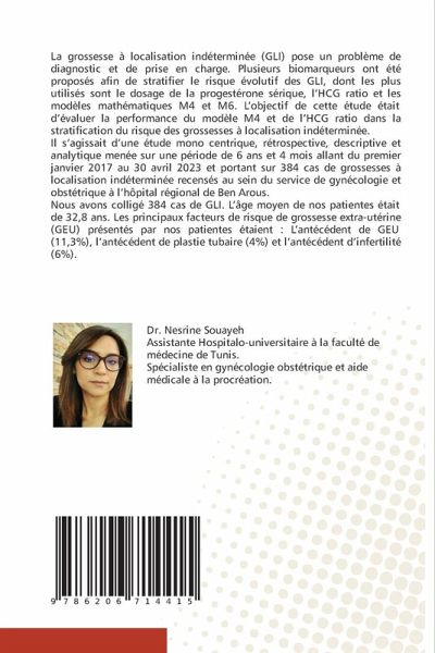 La grossesse à localisation indéterminée (GLI) pose un problème de diagnostic et de prise en charge. Plusieurs biomarqueurs ont été proposés afin de stratifier le risque évolutif des GLI, dont les plus utilisés sont le dosage de la progestérone sérique, l'HCG ratio et les modèles mathématiques M4 et M6. L'objectif de cette étude était d'évaluer la performance du modèle M4 et de l'HCG ratio dans la stratification du risque des grossesses à localisation indéterminée. Il s'agissait d'une étude mono centrique, rétrospective, descriptive et analytique menée sur une période de 6 ans et 4 mois allant du premier janvier 2017 au 30 avril 2023 et portant sur 384 cas de grossesses à localisation indéterminée recensés au sein du service de gynécologie et obstétrique à l'hôpital régional de Ben Arous.Nous avons colligé 384 cas de GLI. L'âge moyen de nos patientes était de 32,8 ans. Les principaux facteurs de risque de grossesse extra-utérine (GEU) présentés par nos patientes étaient : L'antécédent de GEU (11,3%), l'antécédent de plastie tubaire (4%) et l'antécédent d'infertilité (6%).