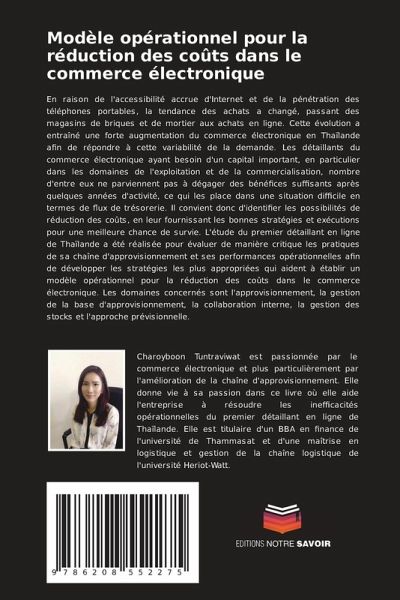 En raison de l'accessibilité accrue d'Internet et de la pénétration des téléphones portables, la tendance des achats a changé, passant des magasins de briques et de mortier aux achats en ligne. Cette évolution a entraîné une forte augmentation du commerce électronique en Thaïlande afin de répondre à cette variabilité de la demande. Les détaillants du commerce électronique ayant besoin d'un capital important, en particulier dans les domaines de l'exploitation et de la commercialisation, nombre d'entre eux ne parviennent pas à dégager des bénéfices suffisants après quelques années d'activité, ce qui les place dans une situation difficile en termes de flux de trésorerie. Il convient donc d'identifier les possibilités de réduction des coûts, en leur fournissant les bonnes stratégies et exécutions pour une meilleure chance de survie. L'étude du premier détaillant en ligne de Thaïlande a été réalisée pour évaluer de manière critique les pratiques de sa chaîne d'approvisionnement et ses performances opérationnelles afin de développer les stratégies les plus appropriées qui aident à établir un modèle opérationnel pour la réduction des coûts dans le commerce électronique. Les domaines concernés sont l'approvisionnement, la gestion de la base d'approvisionnement, la collaboration interne, la gestion des stocks et l'approche prévisionnelle.