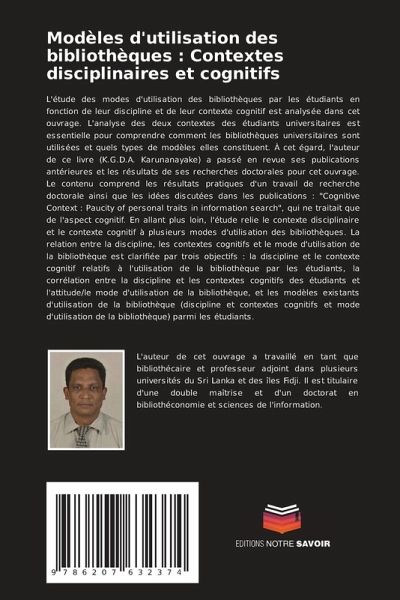 L'étude des modes d'utilisation des bibliothèques par les étudiants en fonction de leur discipline et de leur contexte cognitif est analysée dans cet ouvrage. L'analyse des deux contextes des étudiants universitaires est essentielle pour comprendre comment les bibliothèques universitaires sont utilisées et quels types de modèles elles constituent. À cet égard, l'auteur de ce livre (K.G.D.A. Karunanayake) a passé en revue ses publications antérieures et les résultats de ses recherches doctorales pour cet ouvrage. Le contenu comprend les résultats pratiques d'un travail de recherche doctorale ainsi que les idées discutées dans les publications : "Cognitive Context : Paucity of personal traits in information search", qui ne traitait que de l'aspect cognitif. En allant plus loin, l'étude relie le contexte disciplinaire et le contexte cognitif à plusieurs modes d'utilisation des bibliothèques. La relation entre la discipline, les contextes cognitifs et le mode d'utilisation de la bibliothèque est clarifiée par trois objectifs : la discipline et le contexte cognitif relatifs à l'utilisation de la bibliothèque par les étudiants, la corrélation entre la discipline et les contextes cognitifs des étudiants et l'attitude/le mode d'utilisation de la bibliothèque, et les modèles existants d'utilisation de la bibliothèque (discipline et contextes cognitifs et mode d'utilisation de la bibliothèque) parmi les étudiants.