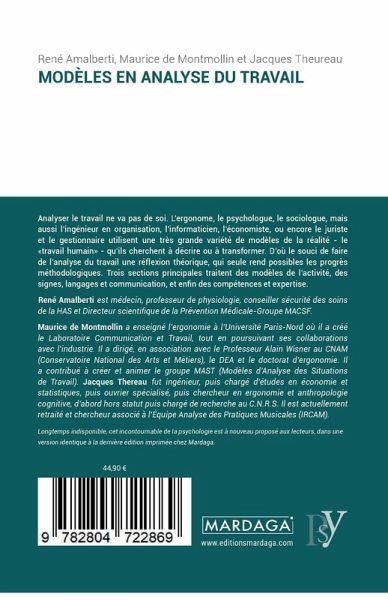 Analyser le travail ne va pas de soi. L'ergonome, le psychologue, le sociologue, mais aussi l'ingénieur en organisation, l'informaticien, l'économiste, ou encore le juriste et le gestionnaire utilisent une très grande variété de modèles de la réalité - le "travail humain" - qu'ils cherchent à décrire ou à transformer. D'où le souci de faire de l'analyse du travail une réflexion théorique, qui seule rend possibles les progrès méthodologiques. Trois sections principales traitent des modèles de l'activité, des signes, langages et communication, et enfin des compétences et expertise. René Amalberti est médecin, professeur de physiologie, conseiller sécurité des soins de la HAS et Directeur scientifique de la Prévention Médicale-Groupe MACSF.//Maurice de Montmollin a enseigné l'ergonomie à l'Université Paris-Nord où il a créé le Laboratoire Communication et Travail, tout en poursuivant ses collaborations avec l'industrie. Il a dirigé, en association avec le Professeur Alain Wisner au CNAM (Conservatoire National des Arts et Métiers), le DEA et le doctorat d'ergonomie. Il a contribué à créer et animer le groupe MAST (Modèles d'Analyse des Situations de Travail). Jacques Thereau fut ingénieur, puis chargé d¿études en économie et statistiques, puis ouvrier spécialisé, puis chercheur en ergonomie et anthropologie cognitive, d¿abord hors statut puis chargé de recherche au C.N.R.S. Il est actuellement retraité et chercheur associé à l¿Équipe Analyse des Pratiques Musicales (IRCAM).
