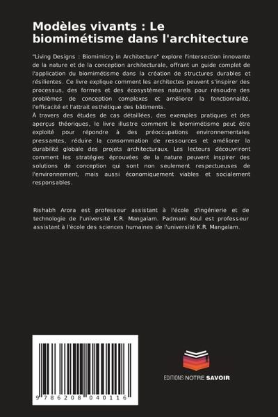 "Living Designs : Biomimicry in Architecture" explore l'intersection innovante de la nature et de la conception architecturale, offrant un guide complet de l'application du biomimétisme dans la création de structures durables et résilientes. Ce livre explique comment les architectes peuvent s'inspirer des processus, des formes et des écosystèmes naturels pour résoudre des problèmes de conception complexes et améliorer la fonctionnalité, l'efficacité et l'attrait esthétique des bâtiments.À travers des études de cas détaillées, des exemples pratiques et des aperçus théoriques, le livre illustre comment le biomimétisme peut être exploité pour répondre à des préoccupations environnementales pressantes, réduire la consommation de ressources et améliorer la durabilité globale des projets architecturaux. Les lecteurs découvriront comment les stratégies éprouvées de la nature peuvent inspirer des solutions de conception qui sont non seulement respectueuses de l'environnement, mais aussi économiquement viables et socialement responsables.