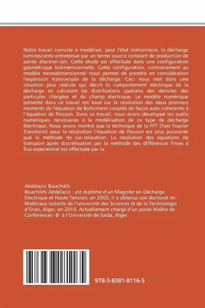 Notre travail consiste à modéliser, pour l'état stationnaire, la décharge luminescente entretenue par un terme source constant de production de paires électron-ion. Cette étude est effectuée dans une configuration géométrique bidimensionnelle. Cette configuration, contrairement au modèle monodimensionnel nous permet de prendre en considération l'expansion transversale de la décharge. Ceci nous met dans une situation plus réaliste qui décrit le comportement électrique de la décharge en calculant les distributions spatiales des densités des particules chargées et du champ électrique. Le modèle numérique présenté dans ce travail est basé sur la résolution des deux premiers moments de l'équation de Boltzmann couplés de façon auto-cohérente à l équation de Poisson. Dans ce travail, nous avons développé les outils numériques nécessaires à la modélisation de ce type de décharge électrique. Nous avons montré que la technique de la FFT (Fast Fourier Transform) pour la résolution l équation de Poisson est plus puissante que la méthode de sur-relaxation. La résolution des équations de transport après discrétisation par la méthode des différences finies à flux exponentiel est effectuée par la