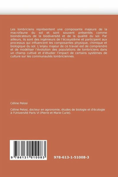 Les lombriciens représentent une composante majeure de la macrofaune du sol et sont souvent présentés comme bioindicateurs de la biodiversité et de la qualité du sol. Par ailleurs, ils sont des ingénieurs de l écosystème et participent aux processus qui influencent les composantes physique, chimique et biologique du sol. L enjeu majeur de ce travail est de comprendre et de modéliser l évolution des populations de lombriciens dans un champ cultivé et d étudier l impact de certains systèmes de culture sur les communautés lombriciennes.