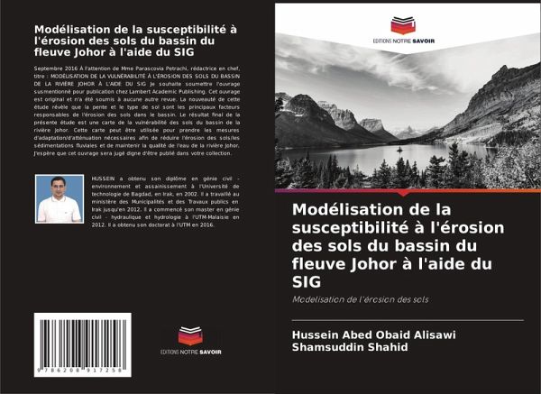 Septembre 2016 À l'attention de Mme Parascovia Petrachi, rédactrice en chef, titre : MODÉLISATION DE LA VULNÉRABILITÉ À L'ÉROSION DES SOLS DU BASSIN DE LA RIVIÈRE JOHOR À L'AIDE DU SIG Je souhaite soumettre l'ouvrage susmentionné pour publication chez Lambert Academic Publishing. Cet ouvrage est original et n'a été soumis à aucune autre revue. La nouveauté de cette étude révèle que la pente et le type de sol sont les principaux facteurs responsables de l'érosion des sols dans le bassin. Le résultat final de la présente étude est une carte de la vulnérabilité des sols du bassin de la rivière Johor. Cette carte peut être utilisée pour prendre les mesures d'adaptation/d'atténuation nécessaires afin de réduire l'érosion des sols/les sédimentations fluviales et de maintenir la qualité de l'eau de la rivière Johor. J'espère que cet ouvrage sera jugé digne d'être publié dans votre collection.