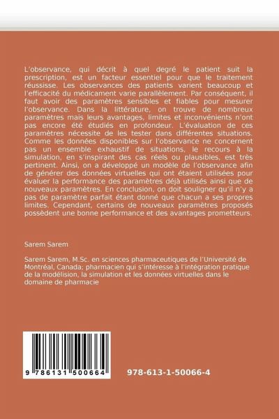 L observance, qui décrit à quel degré le patient suit la prescription, est un facteur essentiel pour que le traitement réussisse. Les observances des patients varient beaucoup et l efficacité du médicament varie parallèlement. Par conséquent, il faut avoir des paramètres sensibles et fiables pour mesurer l observance. Dans la littérature, on trouve de nombreux paramètres mais leurs avantages, limites et inconvénients n ont pas encore été étudiés en profondeur. L évaluation de ces paramètres nécessite de les tester dans différentes situations. Comme les données disponibles sur l observance ne concernent pas un ensemble exhaustif de situations, le recours à la simulation, en s inspirant des cas réels ou plausibles, est très pertinent. Ainsi, on a développé un modèle de l observance afin de générer des données virtuelles qui ont étaient utilisées pour évaluer la performance des paramètres déjà utilisés ainsi que de nouveaux paramètres. En conclusion, on doit souligner qu il n y a pas de paramètre parfait étant donné que chacun a ses propres limites. Cependant, certains de nouveaux paramètres proposés possèdent une bonne performance et des avantages prometteurs.