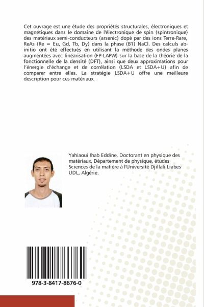 Cet ouvrage est une étude des propriétés structurales, électroniques et magnétiques dans le domaine de l'électronique de spin (spintronique) des matériaux semi-conducteurs (arsenic) dopé par des ions Terre-Rare, ReAs (Re = Eu, Gd, Tb, Dy) dans la phase (B1) NaCl. Des calculs ab-initio ont été effectués en utilisant la méthode des ondes planes augmentées avec linéarisation (FP-LAPW) sur la base de la théorie de la fonctionnelle de la densité (DFT), ainsi que deux approximations pour l'énergie d'échange et de corrélation (LSDA et LSDA+U) afin de comparer entre elles. La stratégie LSDA+U offre une meilleure description pour ces matériaux.