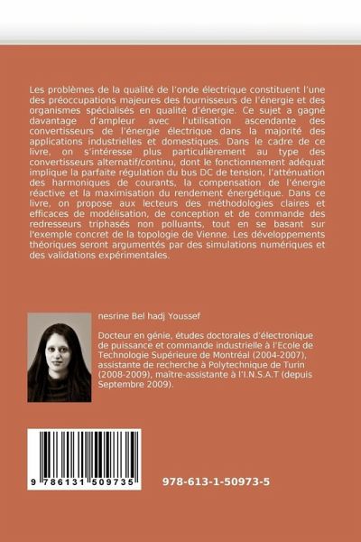 Les problèmes de la qualité de l onde électrique constituent l une des préoccupations majeures des fournisseurs de l énergie et des organismes spécialisés en qualité d énergie. Ce sujet a gagné davantage d ampleur avec l utilisation ascendante des convertisseurs de l énergie électrique dans la majorité des applications industrielles et domestiques. Dans le cadre de ce livre, on s intéresse plus particulièrement au type des convertisseurs alternatif/continu, dont le fonctionnement adéquat implique la parfaite régulation du bus DC de tension, l atténuation des harmoniques de courants, la compensation de l énergie réactive et la maximisation du rendement énergétique. Dans ce livre, on propose aux lecteurs des méthodologies claires et efficaces de modélisation, de conception et de commande des redresseurs triphasés non polluants, tout en se basant sur l'exemple concret de la topologie de Vienne. Les développements théoriques seront argumentés par des simulations numériques et des validations expérimentales.