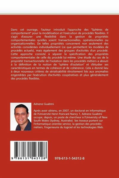 Dans cet ouvrage, l'auteur introduit l'approche des "Sphères de comportement" pour la modélisation et l'exécution de procédés flexibles. Il s'agit d'assurer une flexibilité dans la gestion de propriétés comportementales qu'elles soient transactionnelles, opérationnelles ou organisationnelles. De telles propriétés concernent non seulement des activités considérées individuellement (ce que permettent les modèles de procédés actuels), mais également des groupes d'activités d'un procédé. Cette approche consiste à séparer la spécification des propriétés comportementales de celle du procédé lui-même. Une étude du cas de la propriété transactionnelle de l'isolation dans les procédés métiers a abouti à la définition de la notion de "sphère d'isolation" et d'étudier ses caractéristiques en termes de cohésion et de cohérence. Cela a donné lieu à deux nouveaux critères de sérialisabilité étroitement liés aux anomalies engendrées par l'exécution d'activités coopératives et plus généralement des procédés flexibles.