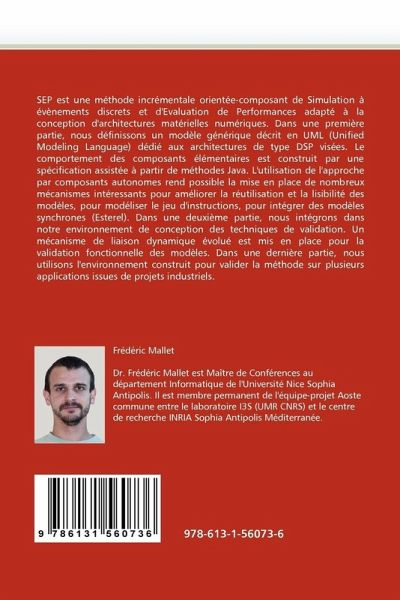 SEP est une méthode incrémentale orientée-composant de Simulation à évènements discrets et d'Evaluation de Performances adapté à la conception d'architectures matérielles numériques. Dans une première partie, nous définissons un modèle générique décrit en UML (Unified Modeling Language) dédié aux architectures de type DSP visées. Le comportement des composants élémentaires est construit par une spécification assistée à partir de méthodes Java. L'utilisation de l'approche par composants autonomes rend possible la mise en place de nombreux mécanismes intéressants pour améliorer la réutilisation et la lisibilité des modèles, pour modéliser le jeu d'instructions, pour intégrer des modèles synchrones (Esterel). Dans une deuxième partie, nous intégrons dans notre environnement de conception des techniques de validation. Un mécanisme de liaison dynamique évolué est mis en place pour la validation fonctionnelle des modèles. Dans une dernière partie, nous utilisons l'environnement construit pour valider la méthode sur plusieurs applications issues de projets industriels.