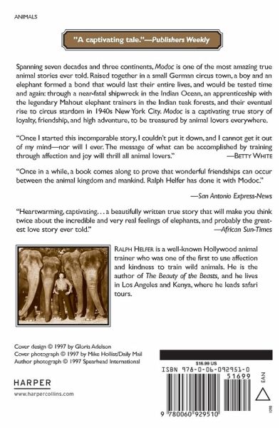 Modoc, the elephant, and Bram, his faithful companion and trainer, formed a bond that lasted their entire lives. Late in their relationship, Modoc was sold behind Bram's back and vanished for more than 20 years. This text records the heart-wrenching events that followed.