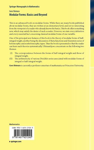 One of the principal new features of this book is the theory of modular forms of half-integral weight, another being the discussion of theta functions and Eisenstein series of holomorphic and nonholomorphic types. Thus the book is presented so that the reader can learn such theories systematically. Ultimately, we concentrate on the following two themes: