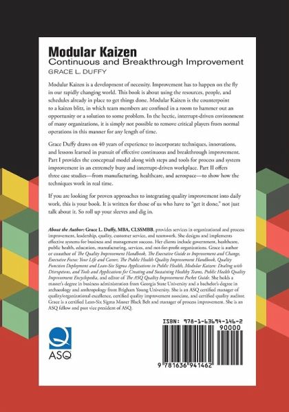 Modular kaizen is a development of necessity in our rapidly changing world where improvement has to happen "on the fly". Modular kaizen is the counter point to kaizen blitz, where team members are locked in a room to hammer out a solution to some problem or opportunity. In the hectic, interrupt driven environment of many organizations, it is simply not possible to remove critical players from normal operations for any length of time. Modular kaizen is an improvement approach that integrates quality techniques into the busy schedule of everyday activities. All of the components of an effective kaizen event are planned; however, the activities are scheduled in small segments, or "modules" that fit the rapidly changing time demands of team members and subject matter experts. This approach is complementary to the Plan-Do-Check-Act (PDCA) and Define, Measure, Analyze, Improve, Control (DMAIC) models of quality improvement. The author of this book calls upon a 40 year career to incorporate techniques, innovations and lessons learned in the pursuit of effective continuous and breakthrough improvement and use the resources, people, and schedules already in place to get things done. If you are looking for proven approaches to integrating quality improvement into daily work, this is your book.