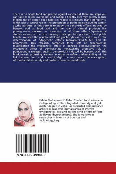 There is no single food can protect against cancer,but there are steps you can take to lower overall risk,and eating a healthy diet may greatly reduce lifetime risk of cancer. Food habits in middle east include many ingredients, which play a central role in the prevention of pathologies,including cancer. So,the purpose of this book is to study the genotoxic effects induced by benzoic acid as food add and the role of natural products like pomegranate molasses in prevention it of these effects.Experimental studies are one of the most pressing challenges facing scientists and public health. We used the peripheral blood lymphocytes as the best assay for the determination of cytogenetic effects biomarkers(CA,MI,MN and RI) parameters. This research comprises three sets of experimental. Investigation the cytogenetic effect of benzoic acid;investigation the cytogenetic effect of pomegranate molasses;the protective role of pomegranate molasses against genotoxicity induced by benzoic acid.This book,reveals promising avenues in order to refine understanding of the links between food and cancer,highlight the way toward the investigating of food additives safety and protect consumers worldwide