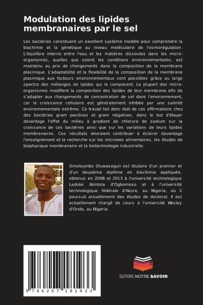 Les bactéries constituent un excellent système modèle pour comprendre la biochimie et la génétique au niveau moléculaire de l'osmorégulation. L'équilibre interne entre l'eau et les matières dissoutes dans les micro-organismes, quelles que soient les conditions environnementales, est maintenu au prix de changements dans la composition de la membrane plasmique. L'adaptabilité et la flexibilité de la composition de la membrane plasmique aux facteurs environnementaux sont possibles grâce au large spectre des mélanges de lipides qui la composent. La plupart des micro-organismes modifient la composition des lipides de leur membrane afin de s'adapter aux changements de concentration de sel dans l'environnement, car la croissance cellulaire est généralement inhibée par une salinité environnementale extrême. Ce travail fait donc état de ces affirmations chez des bactéries gram positives et gram négatives, dans le but d'étayer davantage l'effet du milieu à gradient de chlorure de sodium sur la croissance de ces bactéries ainsi que sur les variations de leurs lipides membranaires. Ces résultats devraient contribuer à éclairer davantage l'enseignement et la recherche sur les microbes alimentaires, les études de biophysique membranaire et la biotechnologie industrielle.