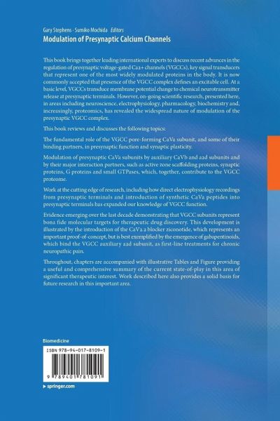 This book will bring together leading international experts to discuss recent advances in basic scientific knowledge regarding the regulation of presynaptic Ca2+ channels. Importantly, Ca2+ channels represent one of the most widely modulated proteins in the body, being the target of a range of effector pathways and drugs; this range will be fully represented here. A number of therapeutic drugs target the Ca2+ channel complex, including the anti-epileptic gabapentinoid and analgesic ziconotide drugs and the pharmaceutical industry is searching for Ca2+ channel blocking drugs, particularly in the pain, epilepsy, ataxia and migraine areas. Such potential future therapies will be discussed here. Scientific disciplines will focus on electrophysiological studies, but will extend to neuroscience, genetics and biochemical areas. The work described will represent advances at the cutting edge of current neuroscience research and is timely and highly appropriate for the Springer book series.